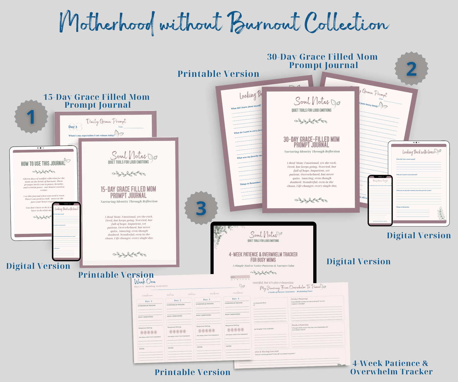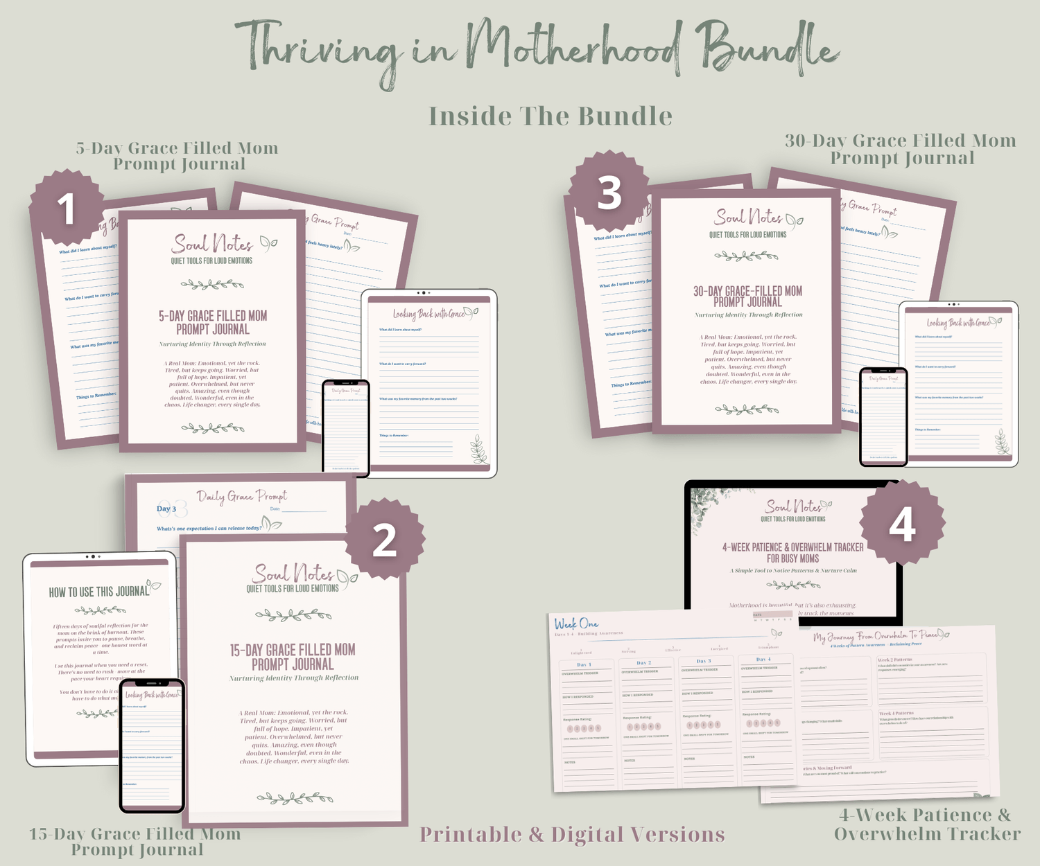 For the mom ready for deep, lasting support. The Thriving in Motherhood Bundle includes this 15-Day Grace Filled Mom Prompt Journal, the 30-day Grace Filled Mom Prompt Journal, the 4-Week Patience Tracker, and the 5-Day Grace Filled Prompt Journal for one discounted price.
