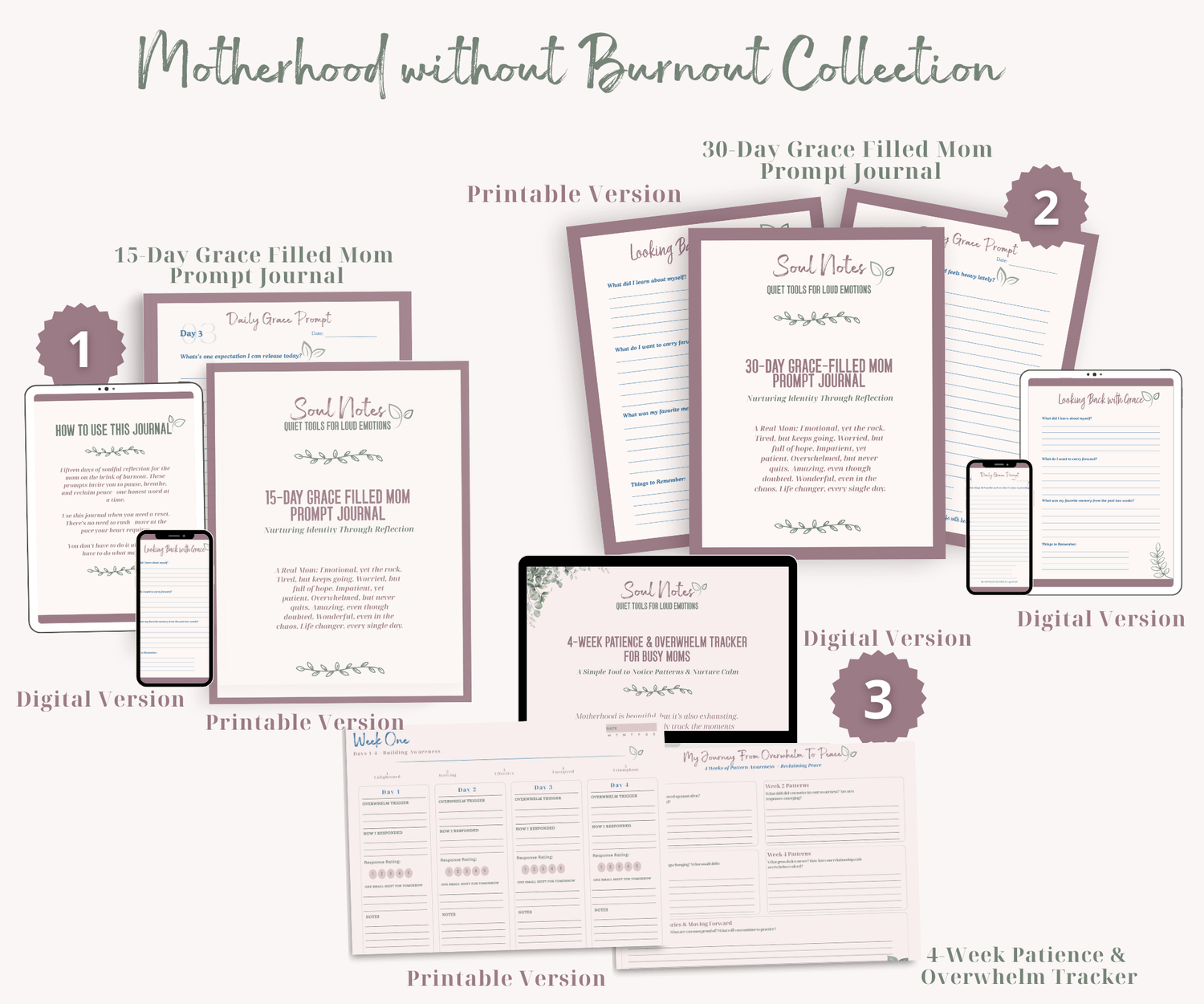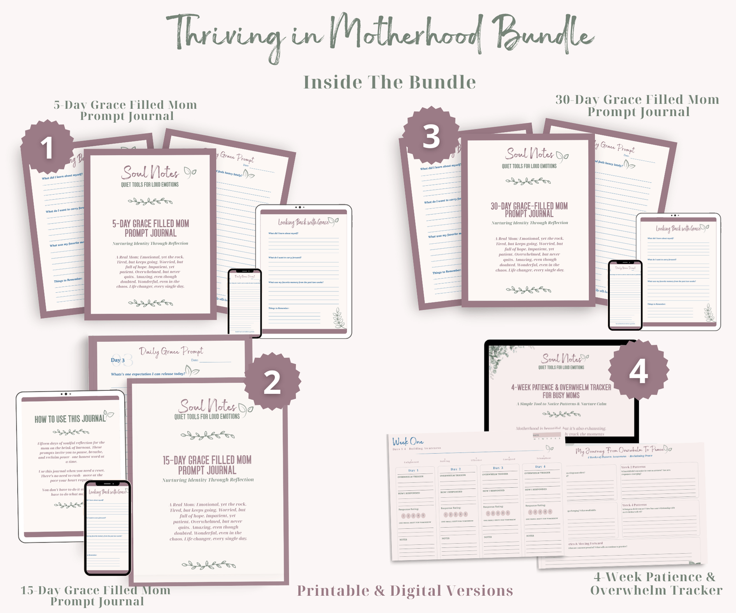 Ready for the full-spectrum support? The Thriving in Motherhood Bundle includes this 30-Day Grace Filled Mom Prompt Journal, plus the 15-Day Grace Filled Mom Prompt Journal, the 4-Week Patience Tracker, and the