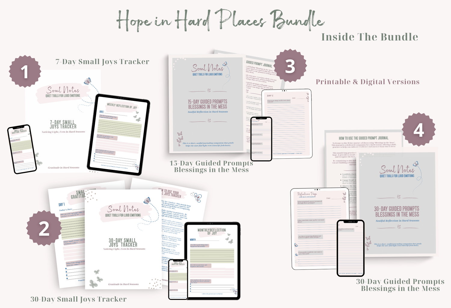Cultivate gratitude and hope even in difficult seasons. The Hope in Hard Places Bundle provides gentle, persistent tools to help you notice small joys and reflect on blessings, fostering resilience when you need it most.
