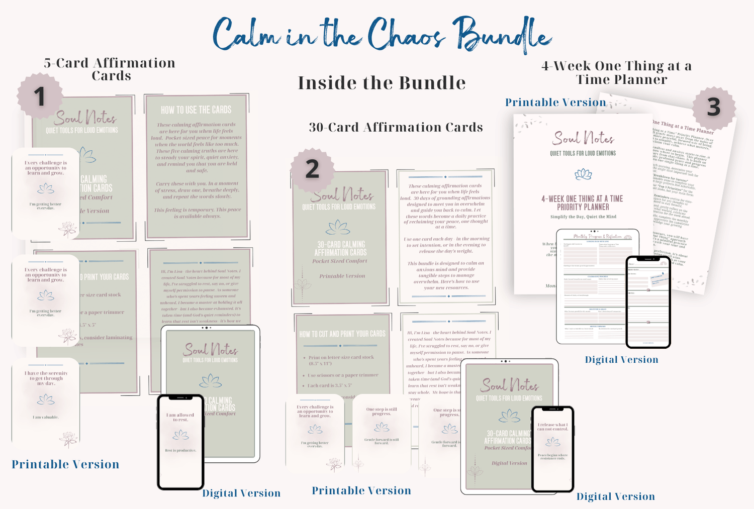 Find your footing when overwhelm hits. The Calm in the Chaos Bundle combines calming affirmations for immediate relief with a simple planner to clear mental clutter, helping you move from anxiety to focused, peaceful action.