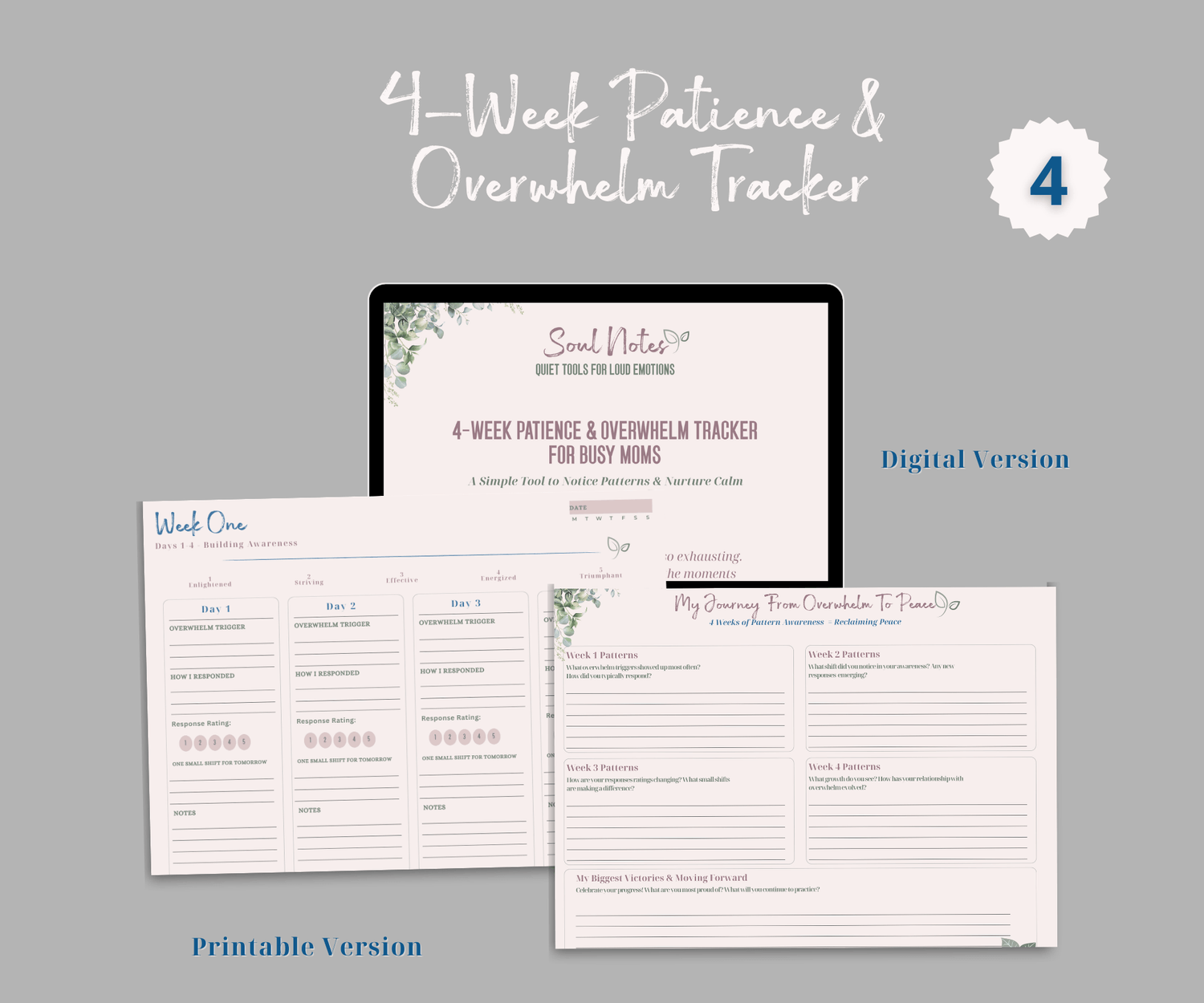 The 4-week journey of the Patience & Overwhelm Tracker is designed to help you navigate the beautiful chaos of motherhood with more grace and less stress. Each day offers a moment of reflection to understand your triggers and celebrate your growing resilience.