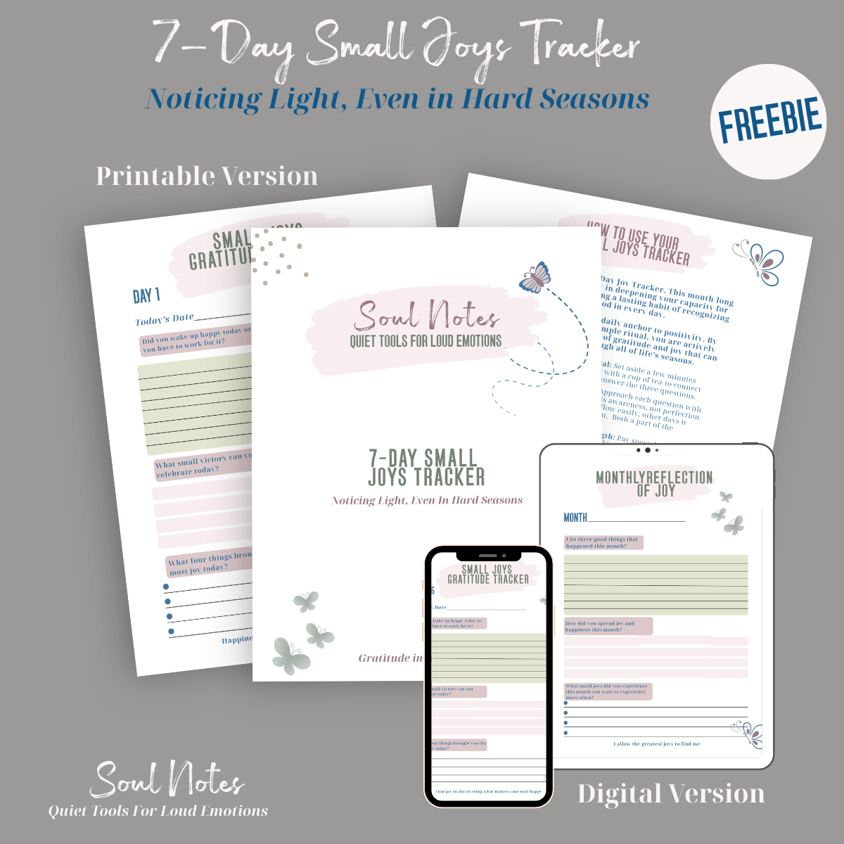 The FREE 7-Day Small Joys Tracker is your tool to pause and acknowledge the good stuff - a warm cup of coffee, a child's laugh, a quiet moment. Use if for