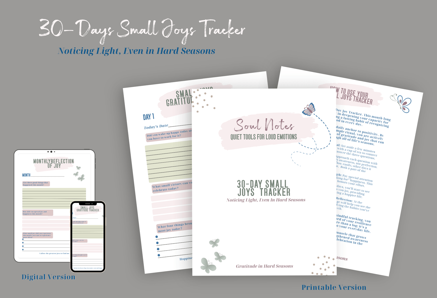 The full 30-day "Small Joys" Tracker is designed to rewire your focus during hard seasons, making it second nature to spot moments of grace and build a resilient