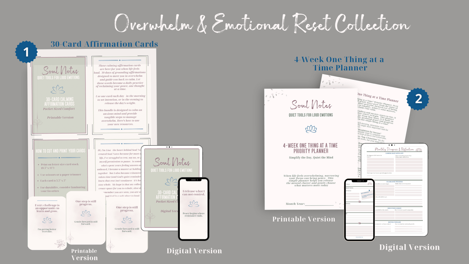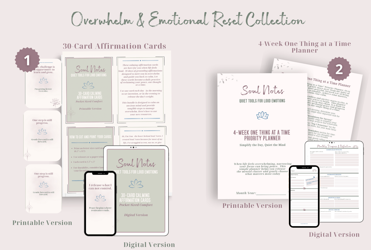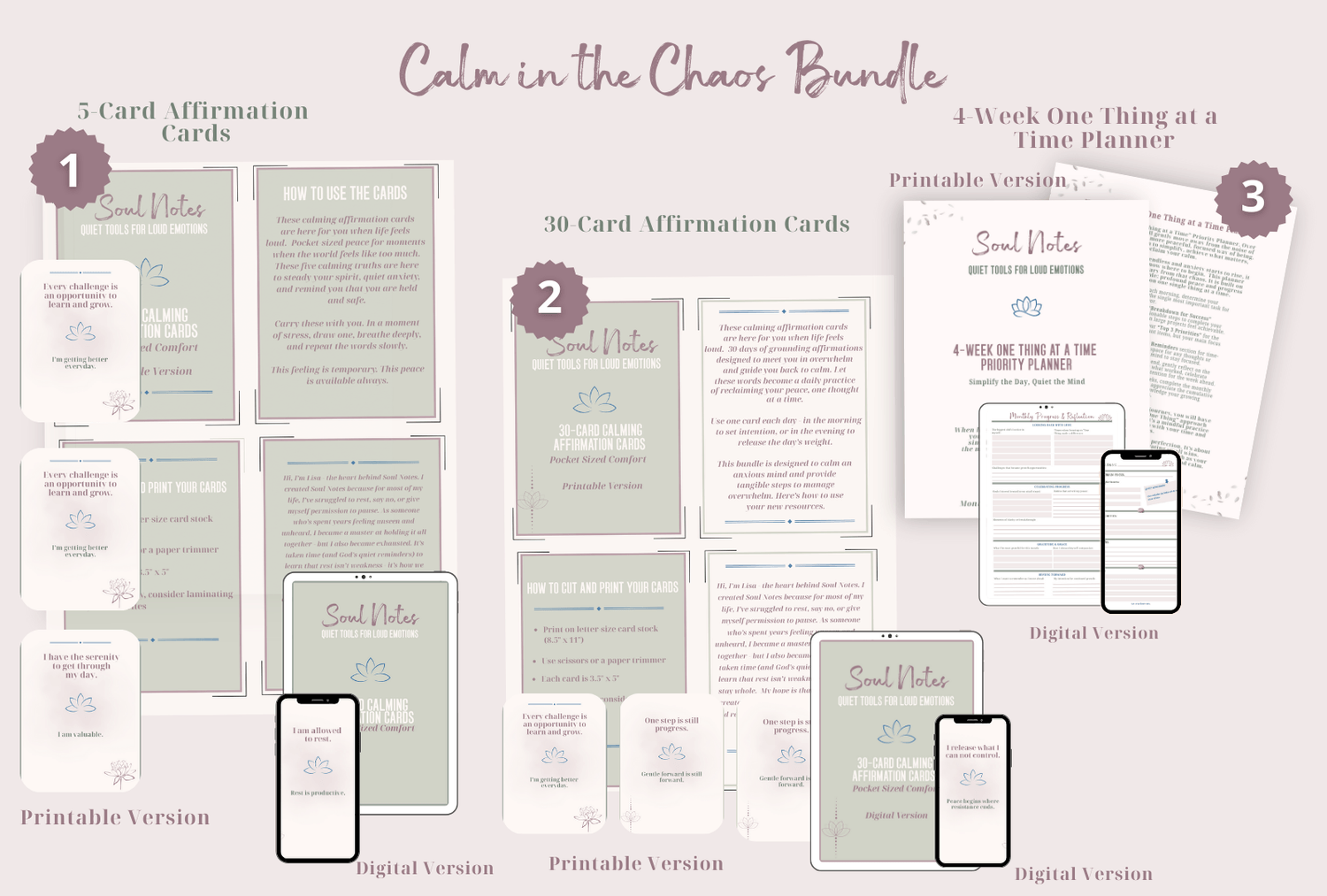 Ready for a holistic approach? The Calm in the Chaos Bundle includes the One Thing At A Time Planner, plus the 30-Day Calming Affirmation Cards and the 5-card set for one discounted price.