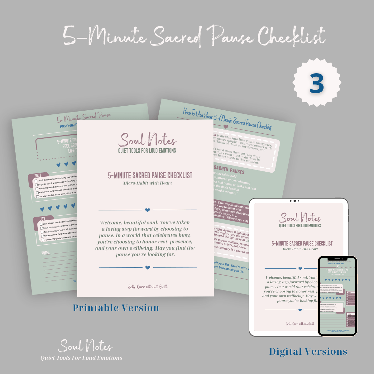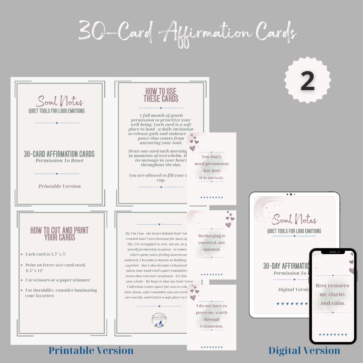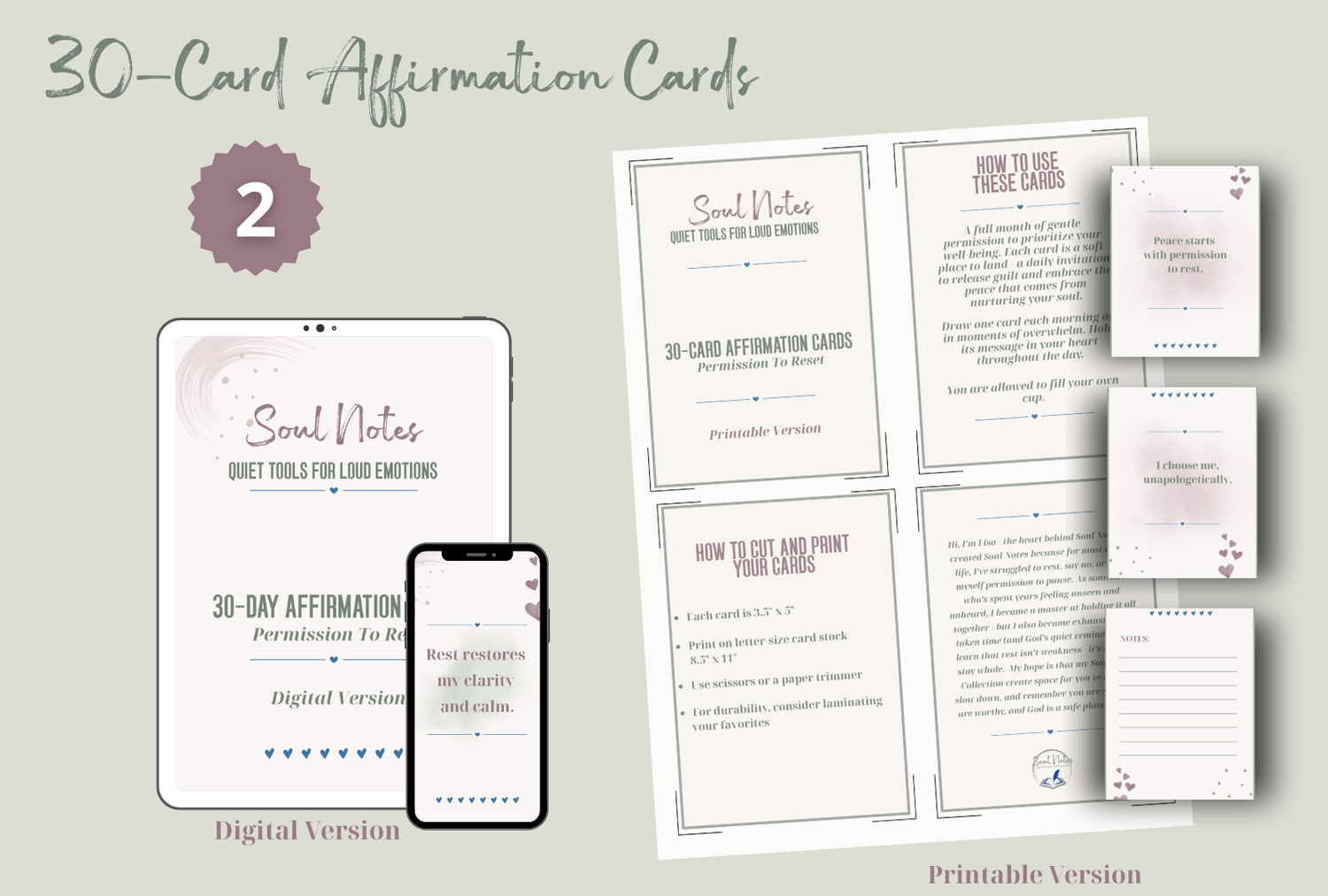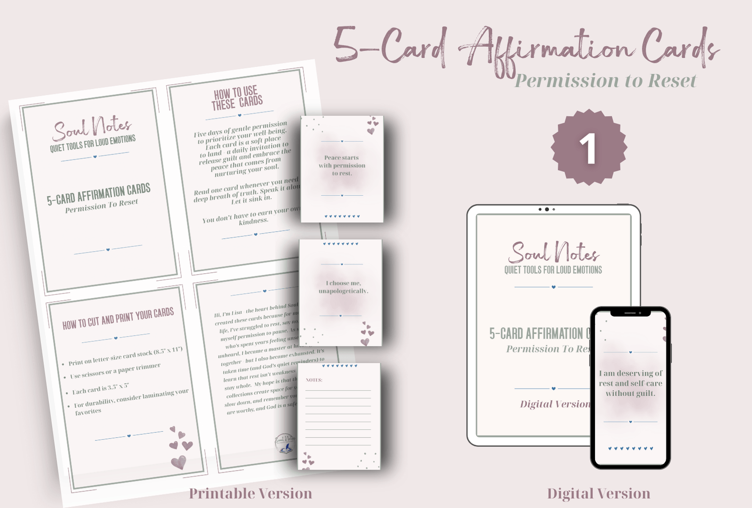 These tools work together to create a powerful daily rhythm. Start your morning by selecting a Permission to Reset Affirmation Card to set a gentle tone. Use the Sacred Pause Checklist for an instant reset during a stressful afternoon. And when you need a quick reminder, the 5-Card set is perfect to place around your home. Together, they provide constant, compassionate reinforcement that you are worthy of care, all day long.