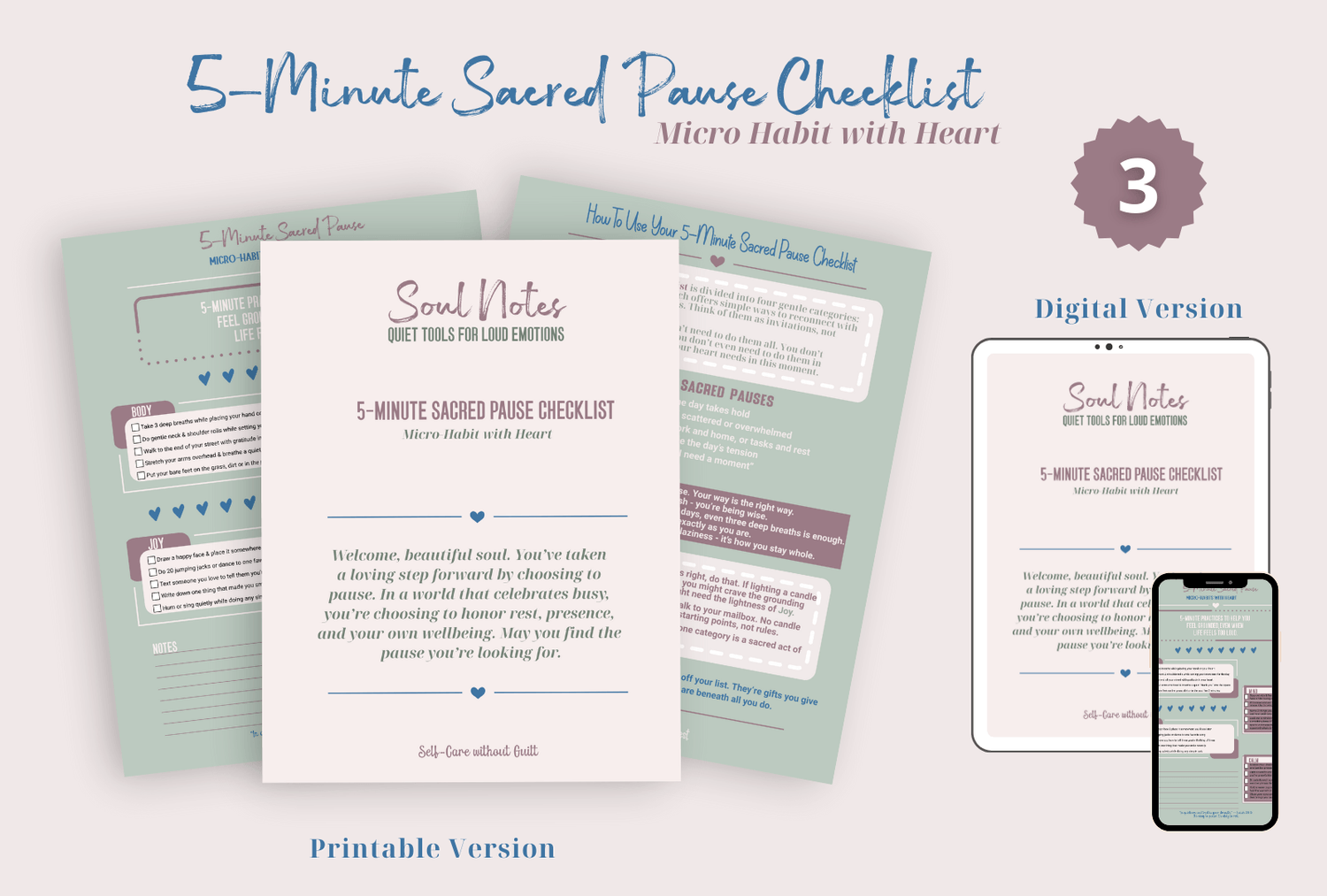 When life feels full, the 5-Minute Sacred Pause Checklist guides you through small, restorative actions to calm your mind and renew your energy. A simple way to honor your need for pause and self-kindness.